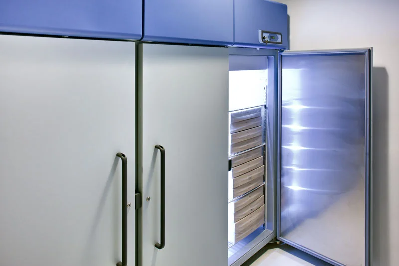 A large climate-controlled film vault with museum-grade archival cases is providing the best storage conditions for the long-term preservation of a unique film archive